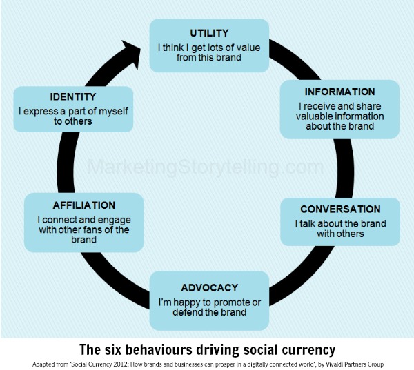 Marketing experts link the motivation to share a piece of content to the social currency of a brand. Social currency refers to how much influence a brand has on social networks and communities (both online and offline). It can be measured by how much a business or brand is shared by consumers.