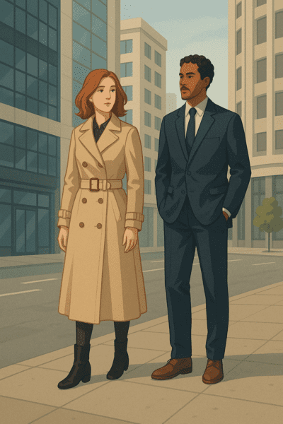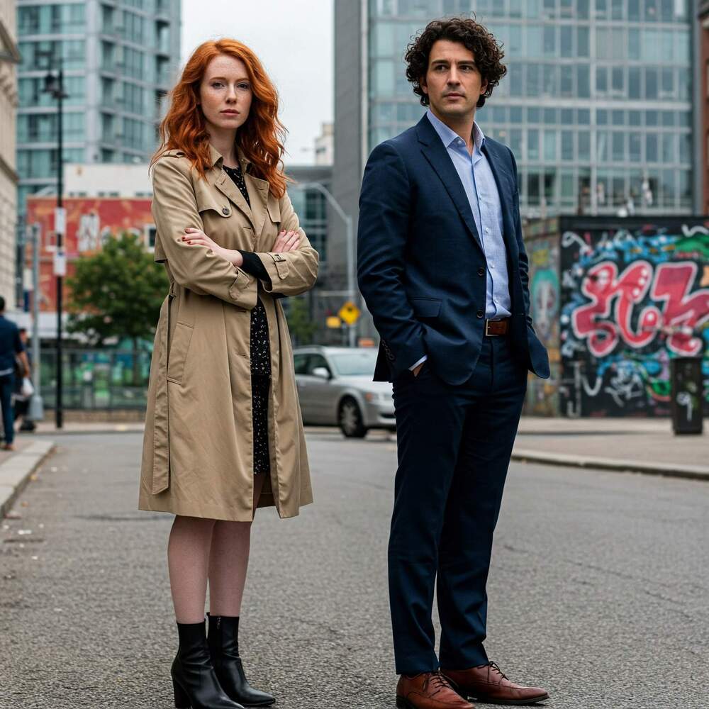 “A woman with shoulder-length red hair, wearing a beige trench coat and black boots, standing next to a man with short curly hair, wearing a navy suit and brown shoes, in a modern city street.”