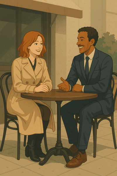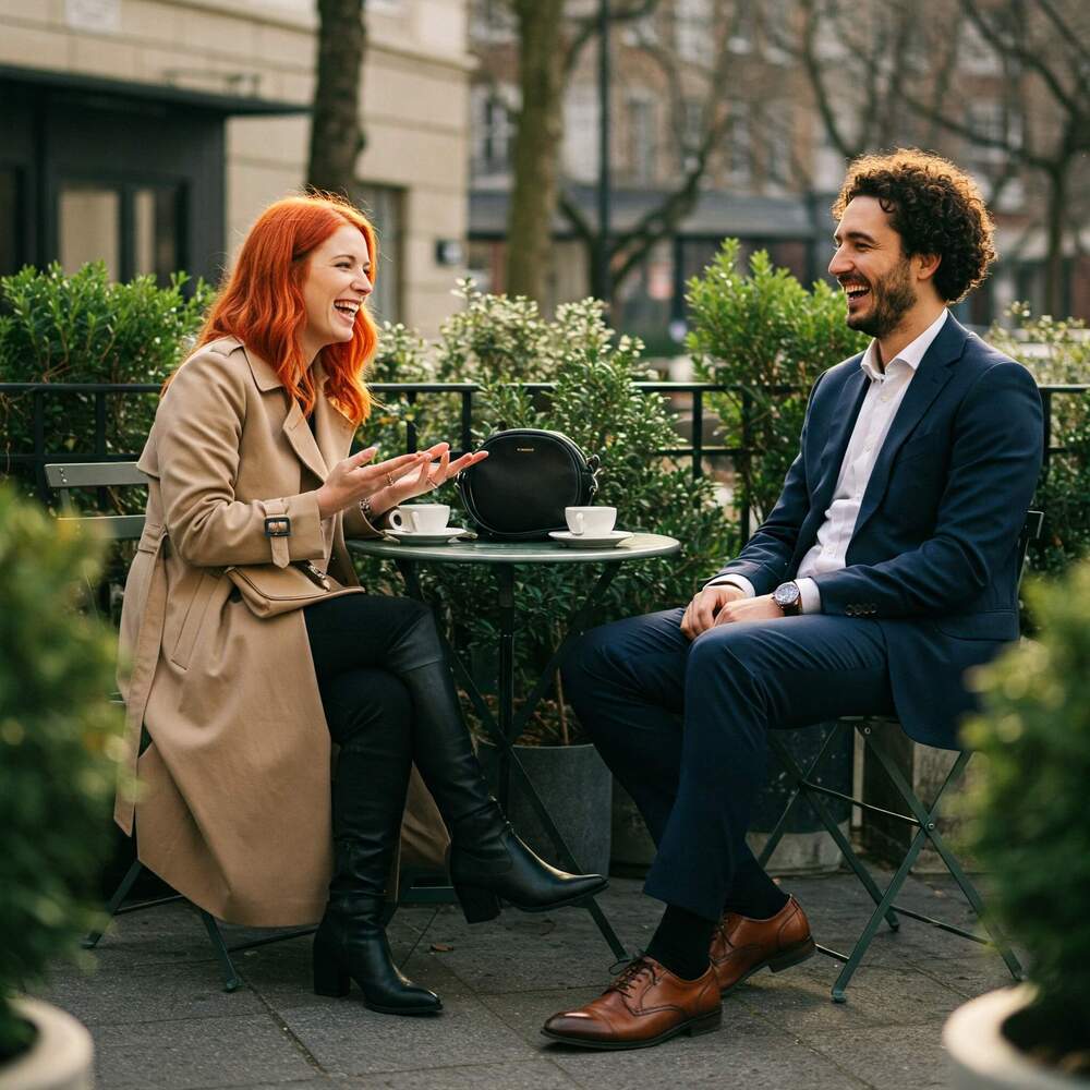 “The same woman and man, wearing the same outfits, now sitting at a café table outdoors, talking and smiling. Maintain their appearance and clothing for consistency.”