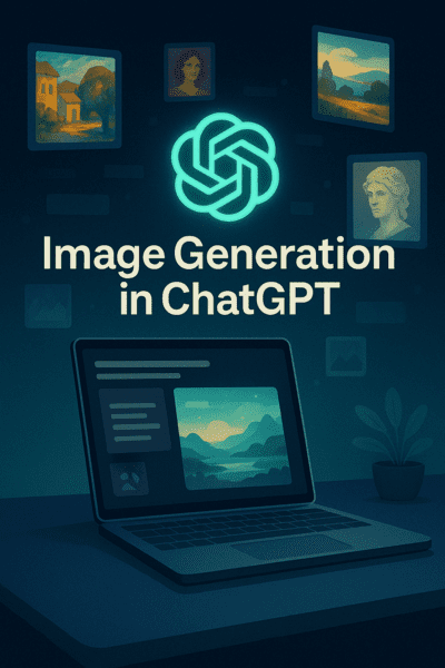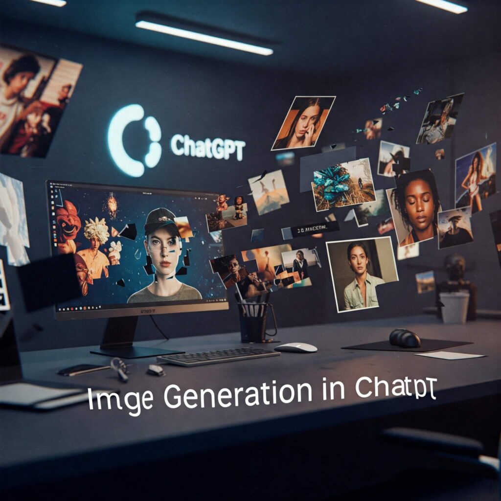 “A sleek digital workspace with a glowing ChatGPT logo in the background, surrounded by floating, partially-generated images (art, portraits, landscapes, etc.) forming from text prompts. Modern, creative, futuristic aesthetic. Include the text: ‘Image Generation in ChatGPT’ in clean, bold typography.”