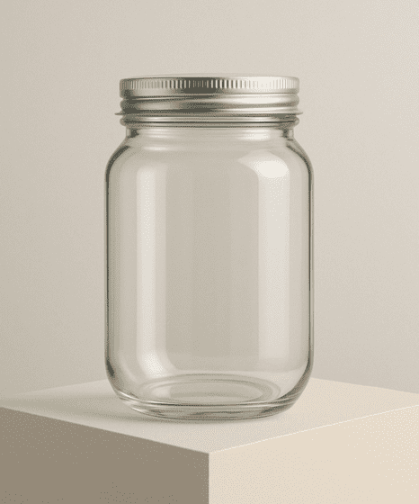 “A high-resolution product photo of a blank, transparent glass jar placed on a minimalist pedestal. The scene is illuminated with soft, diffused studio lighting, featuring subtle reflections and gentle shadows. The composition exudes a sophisticated and elegant mood, making it ideal for showcasing packaging labels.”