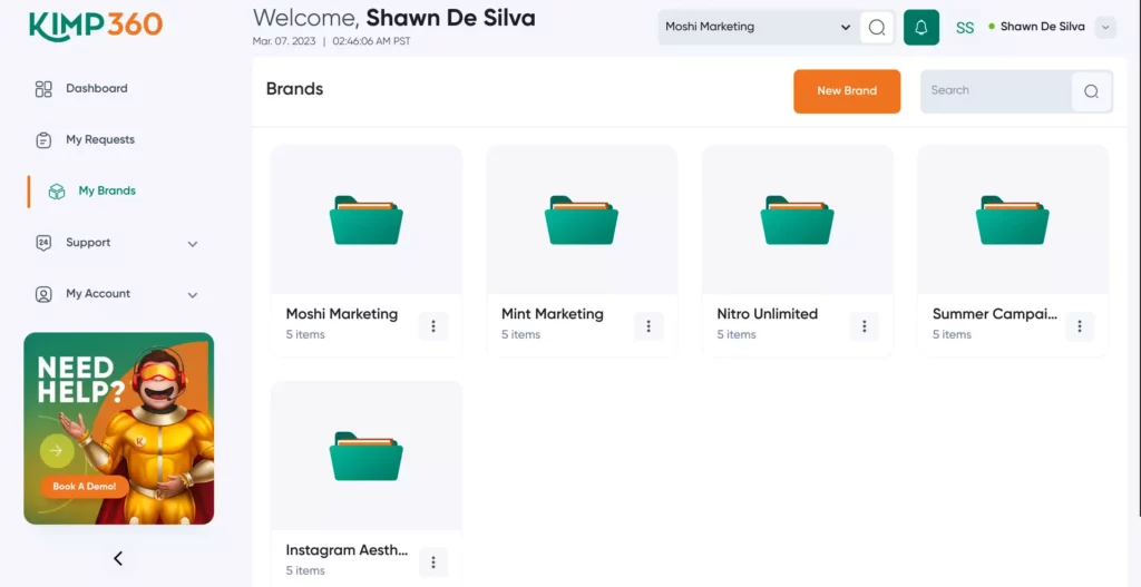 The actual workflow depends entirely on the chosen design agency’s approach. Some have in-house project management tools like KIMP360 with KIMP. KIMP360 allows you to manage multiple brands all on one convenient dashboard.