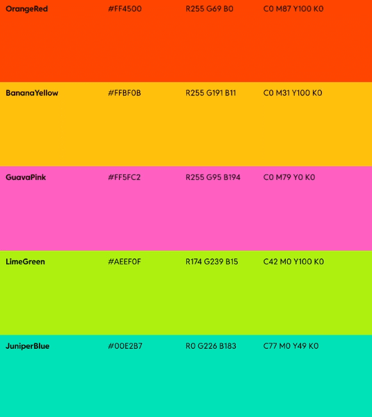 However, they have also added a bunch of other bold and peppy hues to their brand color palette now. These are colors that perfectly contrast and complement the primary Orangered while also adding a fun twist to the brand’s designs.